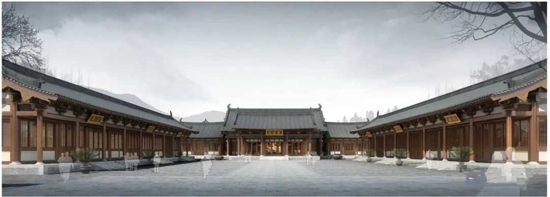 ▲瑞州府衙大堂(效果图)大堂为单檐悬山建筑,面阔五间,进深三间。前有抱厦三间。通面阔13.31m,通进深22.68m。