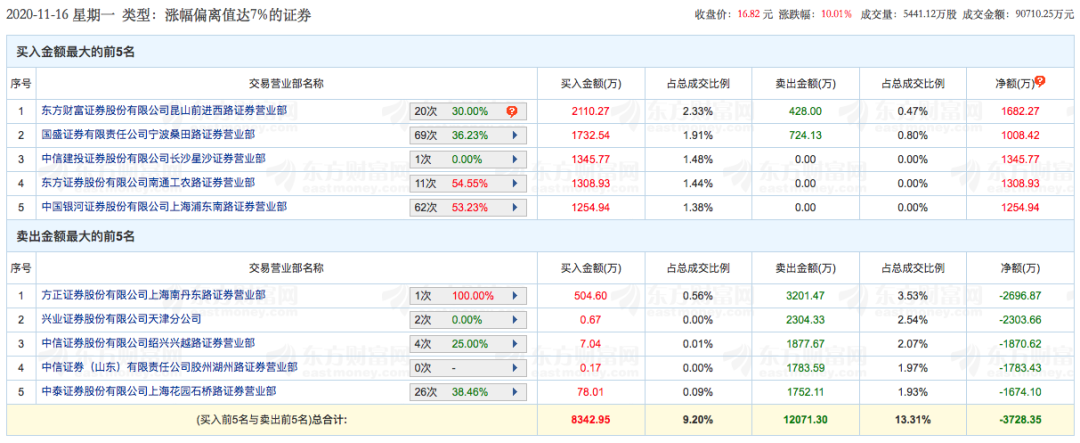11月16日,朗姿股份收报16.82元,涨10.01%,偏离值9.30%,成交额9.07亿元,换手率20.82%。