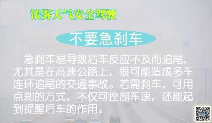 不要猛踩刹车是考虑到雾天无法分辨车距,如果紧急踩刹车的话,会让后车无法判断距离从而导致追尾。如果需要紧急制动的话,可以连续几次轻踩刹车,达到控制车速的目的,并有效地提醒后车注意。