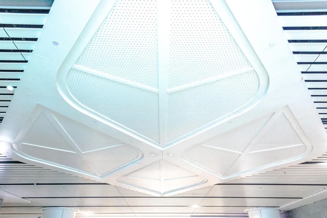 经由进站大厅步入高架候车室,首先映入眼帘的是铺满整个候车室天花板的树叶形状吊顶,穿孔铝板疏密渐变,增加空间的层次感。主色调以灰白为主,简洁大方。