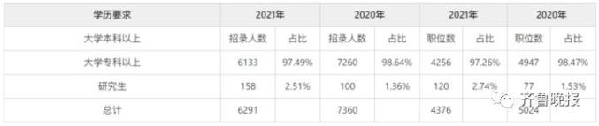 2021山东公务员考试招录计划中,有4597个名额、3376个职位要求最低学历为本科,占总人数的73.07%,占总职位数的77.15%;占比均比去年提升了四个百分点,其次是大专学历,有1409个名额、812个职位最低学历要求为专科,占总人数的22.40%,占总职位数的18.56%,从大专学历的数据可看出,无论是招录人数、职位数还是所占比例,均比去年有所减少,而要求本科及以上学历的名额占总人数的78.6%,比去年同期的74.29%高出4个百分点,由此可见,2021山东省考招录门槛有一定抬升。此外,本次招录还为打破学历樊篱对某些条件进行“松绑”,建立了以品德和能力为导向、以职位需求为目标的人才使用机制,着力破除高校毕业生学习方式、海外留学人员学历认证等方面的限制,对非全日制研究生与全日制研究生同等对待,国内外高校毕业生一视同仁,享受平等的竞争机会。