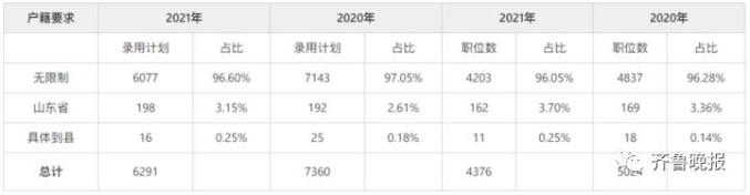 2021山东省考在户籍门槛的设置上依然相当宽松,表格显示出,96.60%的名额、96.05%%的职位没有户籍要求,全国各地的考生只要符合相关条件都可以报名,胸怀宽广、广纳贤才。七、91.77%的职位考B类试卷