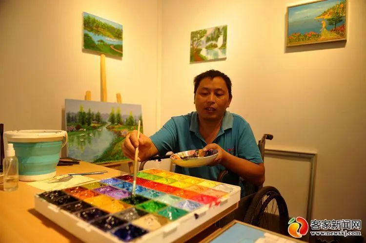 图为卢保华工作室。2019年6月书画义卖,卢保华的9幅画作被一抢而空,不仅获得了自己绘画的第一笔收入3200多元,还收获了一批绘画订单,让他燃起了创业脱贫的斗志:“只要肯努力,即使双腿残疾,我也一样能用双手画出一片新天地。”