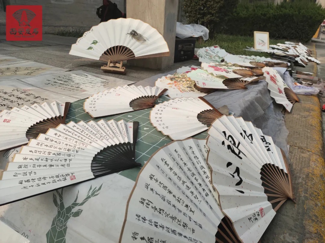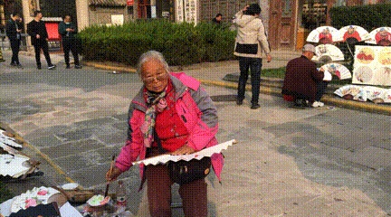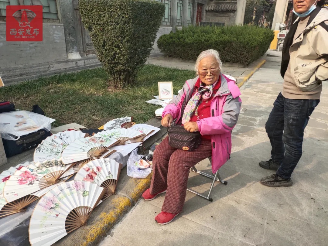 小布来到关中书院门口,只见77岁的扇子奶奶坐在道沿上画着扇面,旁边几位游客在围观。