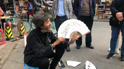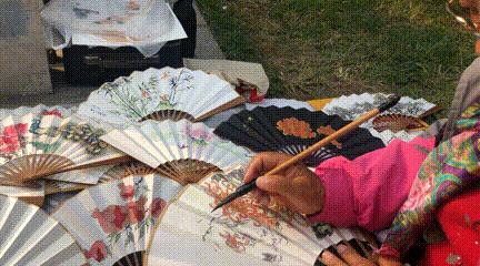 除了扇子奶奶,小布还邂逅了这位扇子哥,一根毛笔一瓶墨,一盘颜料一把扇,就是这些简简单单的工具,让一把平淡无奇的扇子在他手里生出了花样。