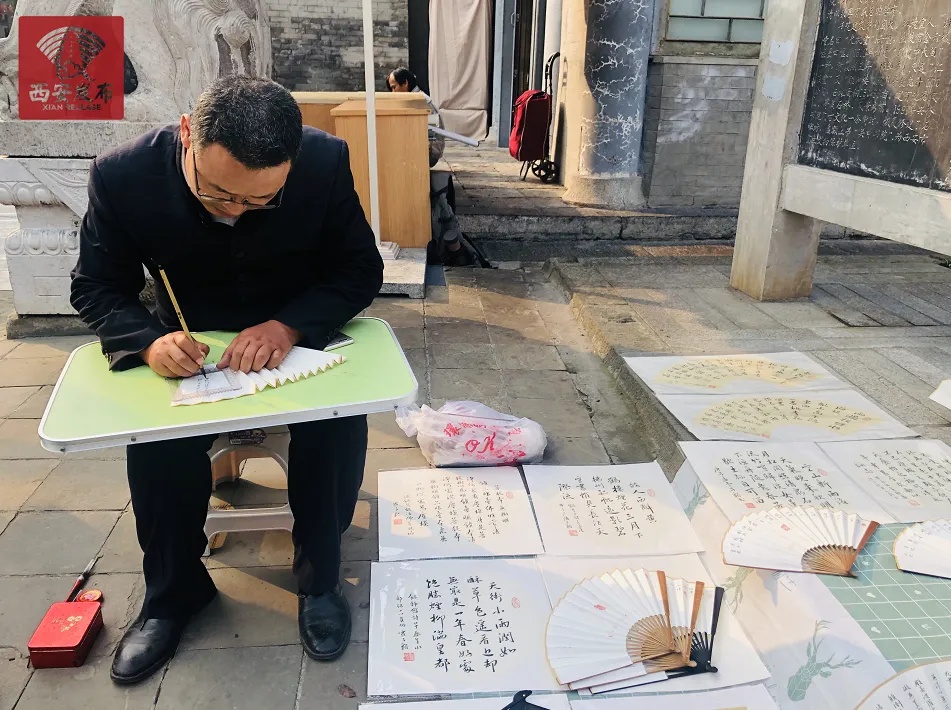一支笔、一个凳、一张纸,在这里一下午,与相邻的古城墙默默对望,眼里是历史,笔下是文化,这就是西安这座城市的文化底蕴。