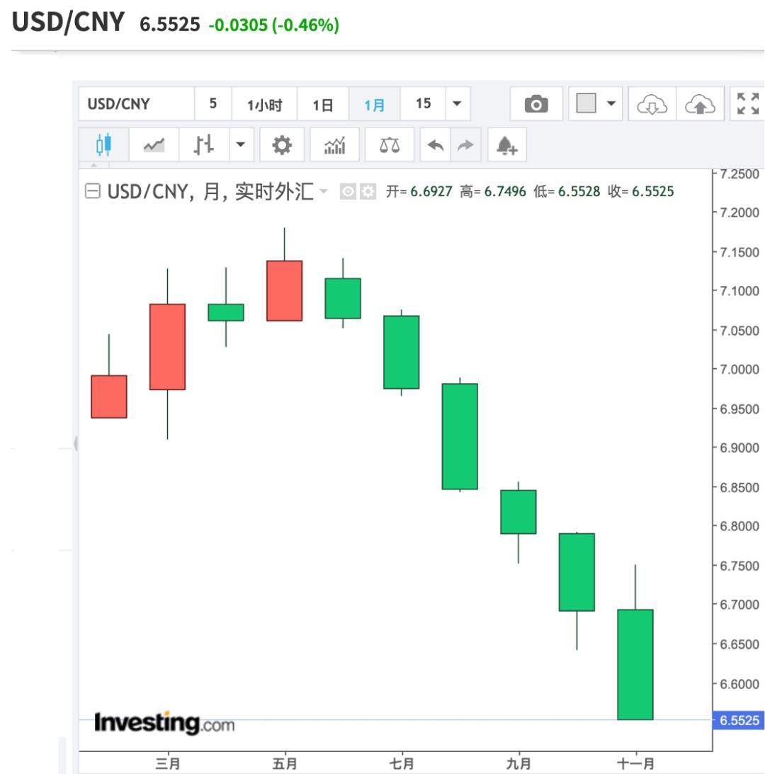 当然,人民币汇率也不是一两天涨成这样的,从今年5月27日到达7.1765的低谷起,人民币已经一路高歌涨了5个多月,涨幅高达8%,罕见狂涨超5500点。
