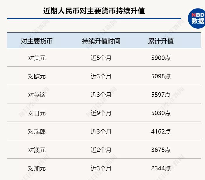 而且,这几个月来人民币的上涨,不仅仅是针对美元,相对欧元、英镑、日元等多国货币,都出现了不同程度的升值。
