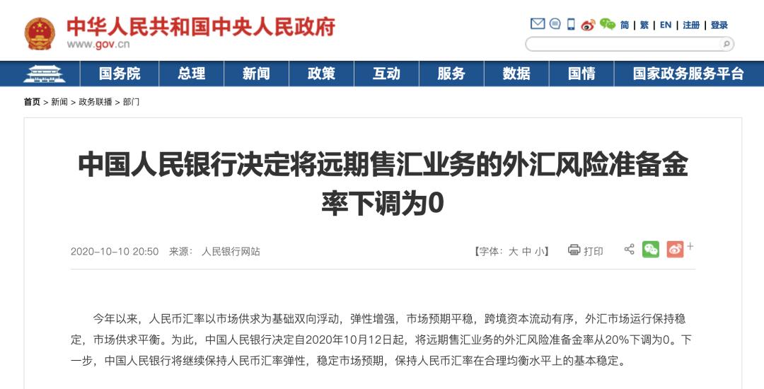 第一个举措是,10月10日,央行宣布将远期售汇业务的外汇风险准备金率从20%下调为0。