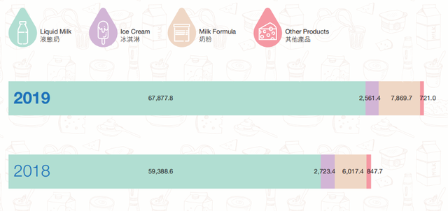 2019年,蒙牛的液态奶产品录得营收678.78亿元,同比增长14.3%,与全局增长趋势基本一致。