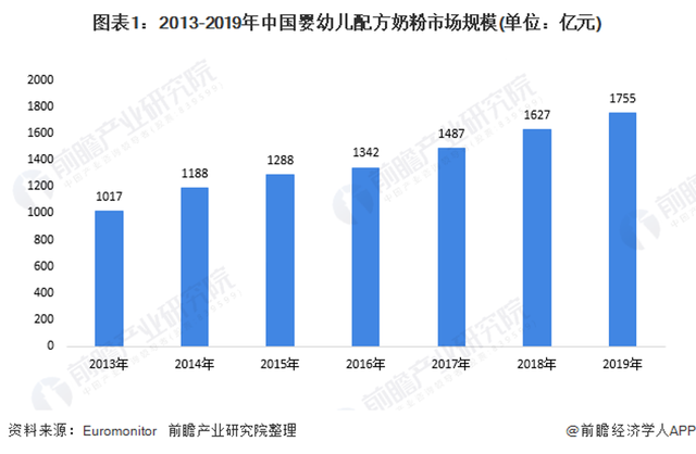 再来看看奶粉领域。数据显示,我国婴幼儿奶粉市场规模从2013年的911亿元增至2017年的1650亿元,年均复合增长率达到16%,2019年达1755亿元,同比增长7.8%。