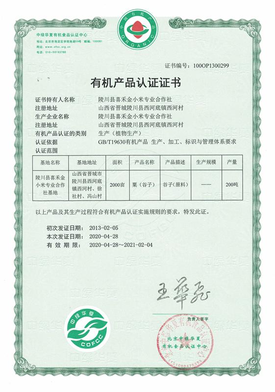 陵川县喜禾金小米专业合作社是农业部命名的国家级农民合作社示范社,拥有有机生产基地2000亩,2013年通过了“国家有机产品认证”和“SC”食品生产许可证,“陵之喜”金小米商标荣获“山西省著名商标”,并申报了陵川小米地理标志认证,2020年8月18日取得了供深食品评价证书。下一步,合作社将开发小米锅巴、小米米粉等一系列深加工产品,提高产品附加值,将“陵川小米”品牌建设成为著名品牌,推动“陵川小米”由“好米”变“名米”,让“名米”卖“好价”。