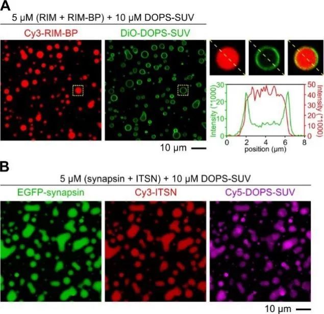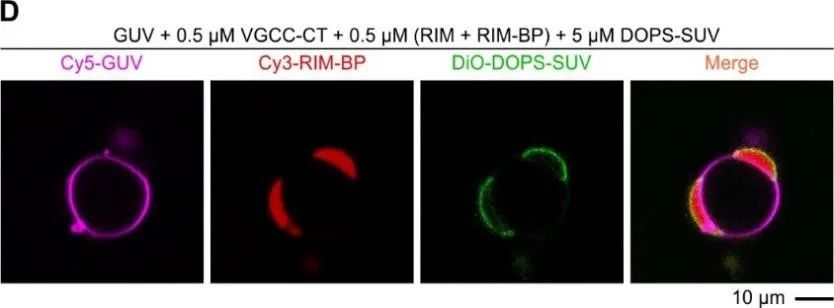 图1 突触小泡覆盖在RIM/RIM-BP凝聚体表面(A)或者与synapsin形成共凝聚体(B)研究者继而制备了巨型单层脂质体(Giant Unilamellar Vesicle, GUV)来模拟突触前膜,在体外实现了“SUV-RIM/RIM-BP凝聚体-GUV”的重构(图2),模拟了“突触小泡-活性区-突触前膜”的结构。