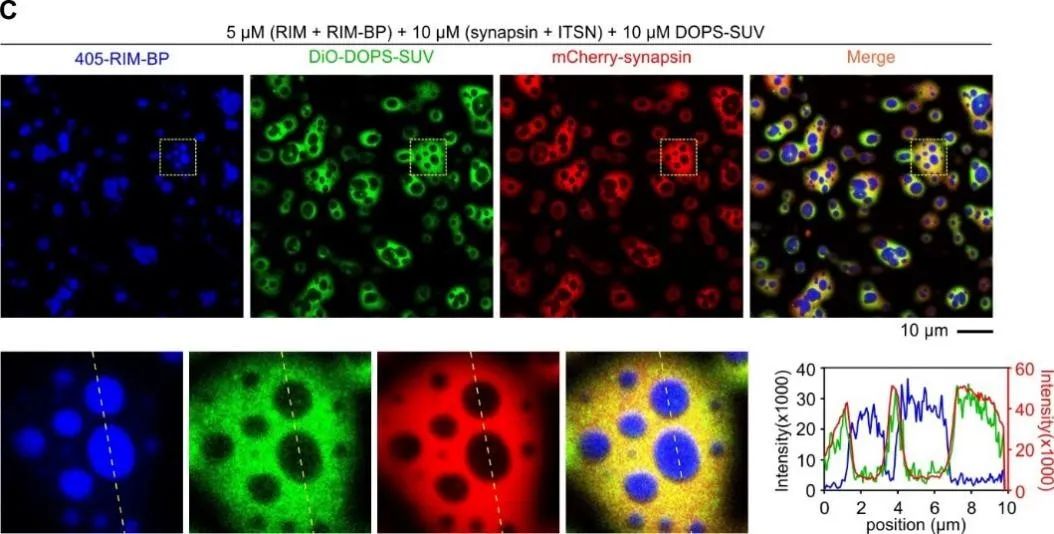 图2 “突触小泡-活性区-突触前膜”的体外重构研究者进一步推测,synapsin和RIM/RIM-BP很有可能都通过相分离和SV产生联系,但是不同的作用方式导致了SV不同的定位效果。于是决定将synapsin,RIM/RIM-BP和SV混合在一起。令人惊讶的是,synapsin和RIM/RIM-BP的凝聚体并不融合,而是形成了synapsin凝聚体包裹着RIM/RIM-BP凝聚体的共凝聚状态,SV则选择和synapsin共定位,并覆盖环绕在RIM/RIM-BP凝聚体表面(图3)。