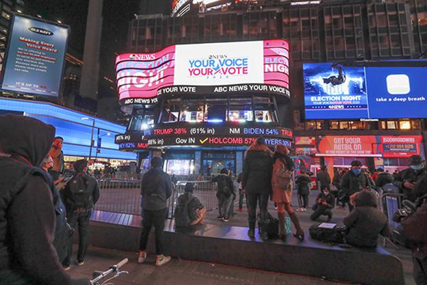 2020年11月3日,纽约时报广场上的电子屏幕显示美国大选实时计票结果。图|新华社