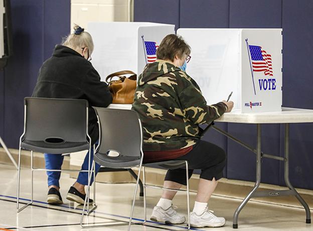 2020年11月3日,在美国威斯康星州基诺沙,选民在一处投票站填写选票。图|新华社