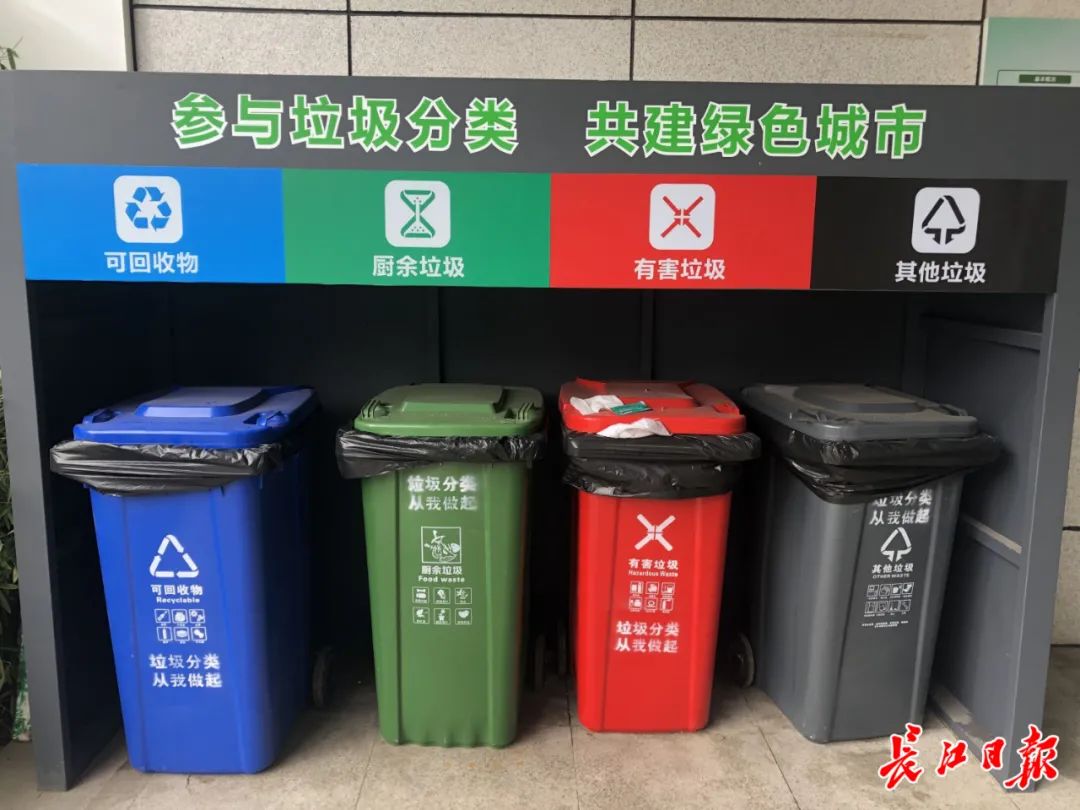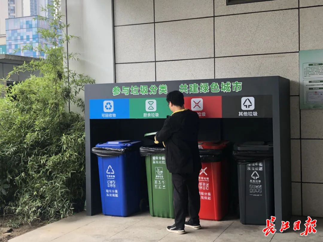 写字楼外设置的分类垃圾桶。记者汪洋 摄收到艾女士留言咨询的问题后,市城管委电话联系了她,并书面回复告知:武汉已经开展垃圾分类工作,废旧电池可以投放在小区内或就近小区、单位设置的有害垃圾容器中。