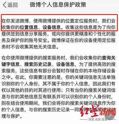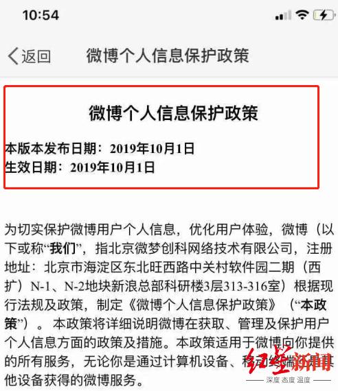 11月18日,当记者重新注册微博账号点开其微博个人信息保护政策时发现,该政策版本发布日期依然停留在2019年10月1日。关于网信办提到的发送微博、使用微博提供位置定位服务等内容,截至发稿未有变化。