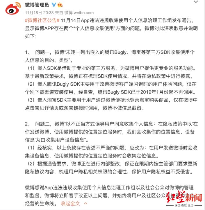 而同日新浪微博发布社区也发布公告称,11月14日App违法违规收集使用个人信息治理工作组发布通告,显示微博App存在两个“个人信息收集使用”方面的问题,微博对此深表歉意。根据通告要求,微博正在进行内部整改,保证在限期内按主管部门要求更新隐私协议内容,梳理用户隐私相关权限的合理性,保护用户隐私权益不受侵害。红星新闻注意到,此次被通告的35个APP,所涉及的问题主要在于收集用户个人信息,却没有同步告知用户相关情况及其使用目的;因用户不同意打开不必要的权限,就拒绝提供业务功能等等。所涉APP则包括了航旅纵横、网易蜗牛读书、优信二手车等知名产品。