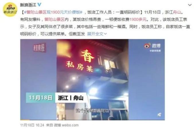 11月18日,有网友爆料舟山普陀山景区1900多元一顿的天价便饭上了热搜,引发关注。