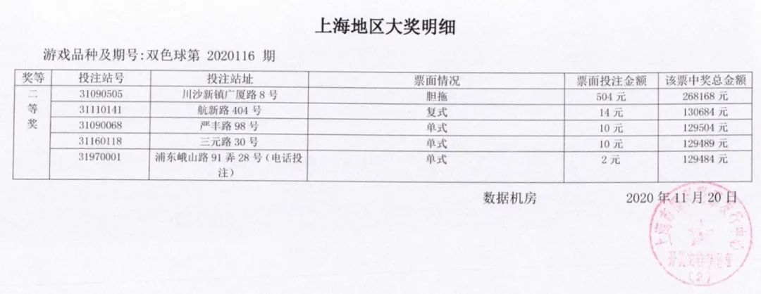 数据显示,上海地区中得6注二等奖,单注奖金129484元,彩票分别售出于川沙新镇广厦路8号、航新路404号、严丰路98号、三元路30号、浦东峨山路91弄28号(电话投注)福彩销售点。派奖情况