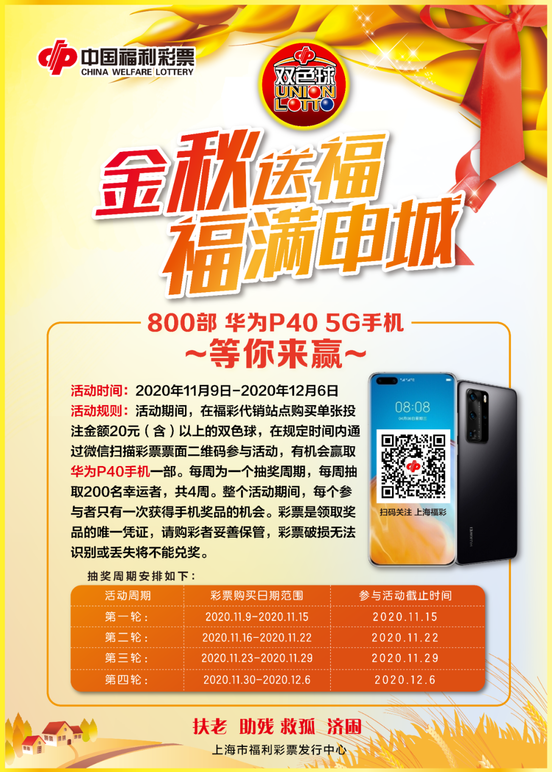 同时,上海福彩“金秋送福 福满申城”双色球实物营销活动也在火热进行中,800部华为P40 5G手机等你来赢!