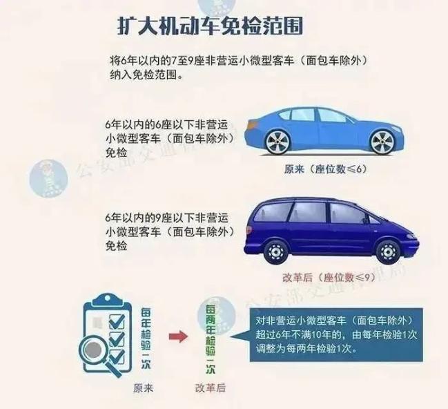 简政放权 5项新措施坚持放管结合此次新措施在实行6年内6座以下非营运小微型客车免检基础上,再次扩大了机动车免检范围,将6年以内的7至9座非营运小微型客车(面包车除外)纳入免检范围。对非营运小微型客车(面包车除外)超过6年不满10年的,由每年检验1次调整为每两年检验1次。车辆发生伤亡交通事故或者非法改装被依法处罚的,仍按原规定周期检验。