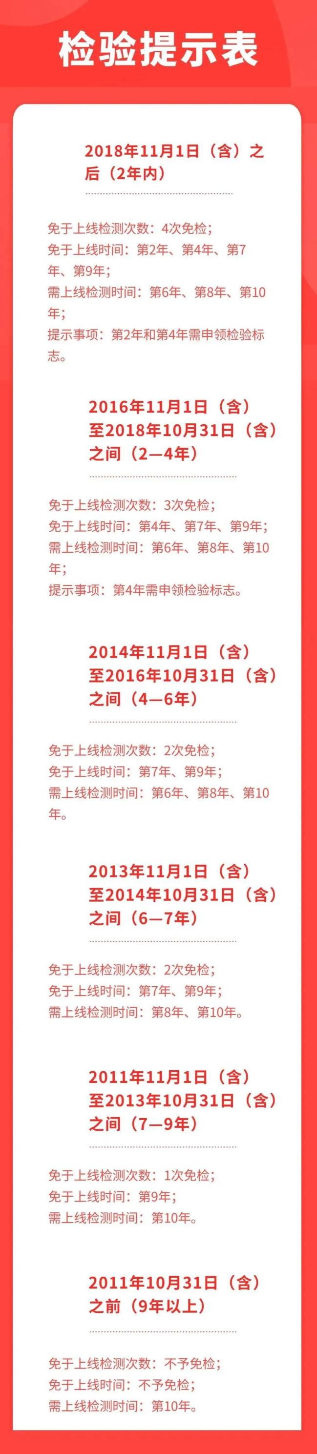 在用车第7年已按规定检验的,第8年免检,第9年、第10年需正常参加检验。在用车第9年已按规定检验的,不享受免检政策,第10年需正常参加检验。