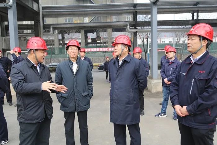 2019年3月,陕煤集团党委书记、董事长杨照乾(右二)在陕焦调研时,姚继峰(左一)介绍有关情况。技术引领未来 打造市场竞争新动能