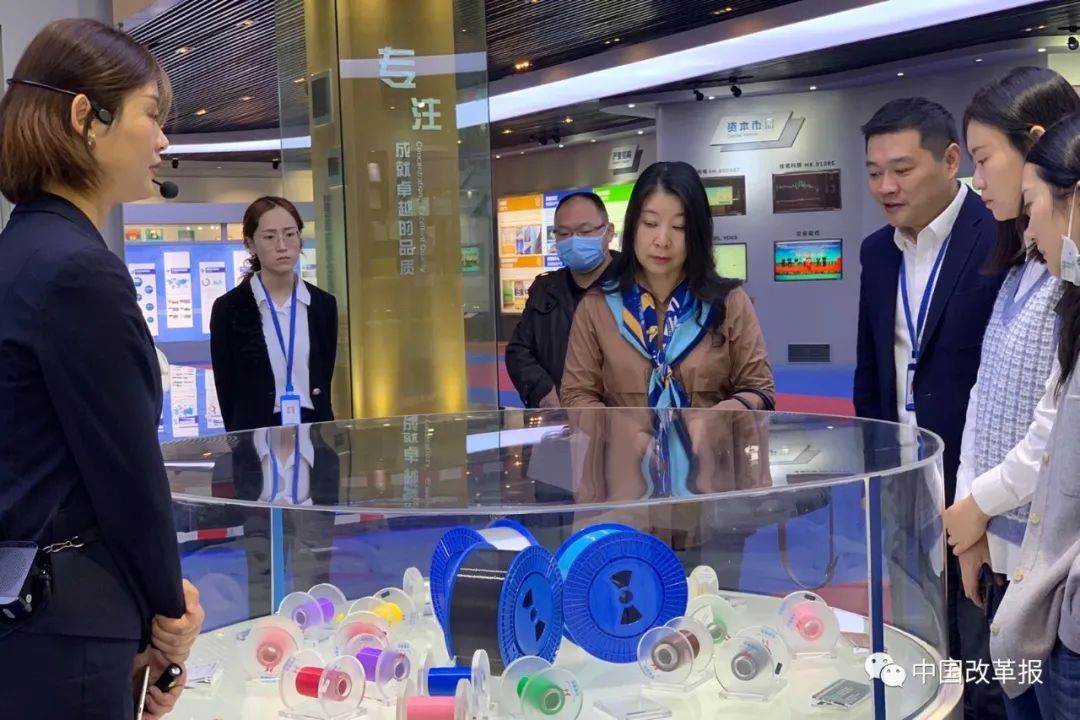▲ 图为亨通集团工作人员向记者介绍光纤产品。过去,光纤预制棒高度依赖进口,国内的光纤光缆企业只能买光棒拉光纤,或者买光纤做光缆。鉴于此,亨通集团投入数亿元进行自主研发,研制出拥有自主技术的光纤预制棒,打破了国外技术垄断。光纤价格也从最初的超过1000元/芯公里,降至目前最低不足20元/芯公里,大幅降低我国光纤使用成本。
