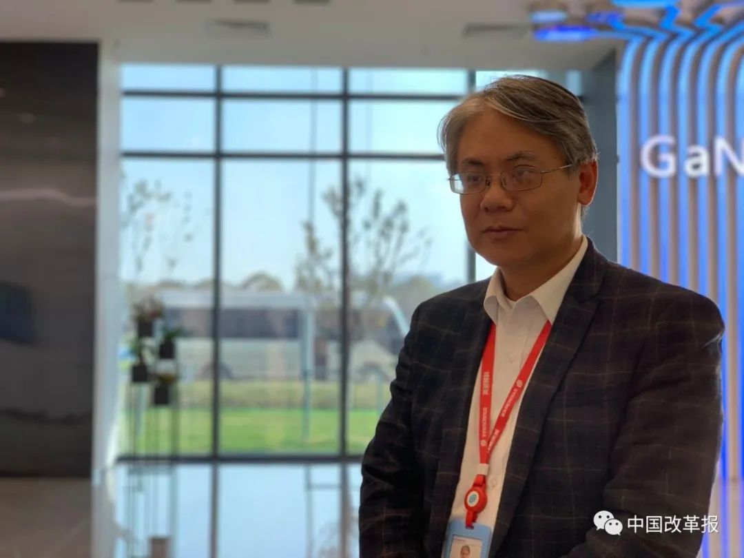 ▲ 图为英诺赛科(苏州)半导体有限公司副总经理王培仁介绍氮化镓项目。“英诺赛科氮化镓项目建成后,将成为世界一流的集研发、设计、外延生产、芯片制造、分装测试等于一体的第三代半导体全产业链研发生产平台。”英诺赛科(苏州)半导体有限公司副总经理王培仁介绍说,目前项目刚刚进入试生产阶段。