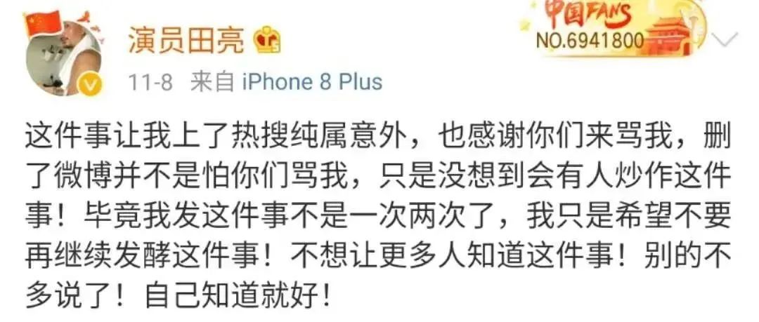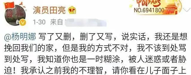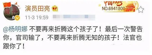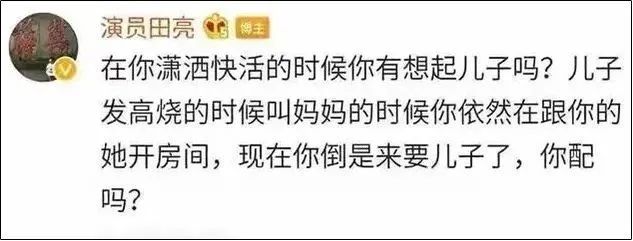 然而,11月7日,田亮突然发文控诉妻子杨明娜出轨,称“儿子发高烧的时候你在外面跟别人开房 ,现在你倒是来要儿子,你配吗?”