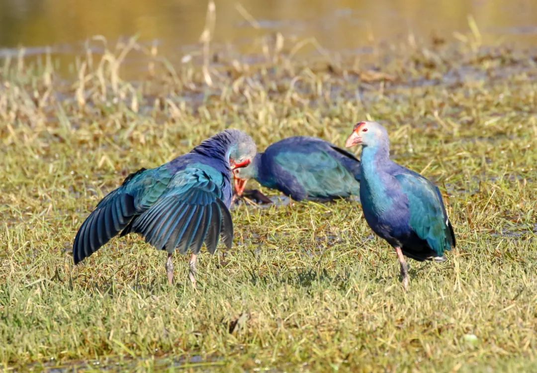 两性同型,体羽大都为紫色或蓝色,尾下覆羽白色,翅和胸蓝绿色。常栖息于江河、湖泊周围的沼泽地和芦苇丛中,以昆虫、软体动物、水草等为食。