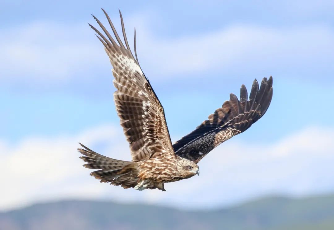 黑 鸢黑鸢,俗称老鹰,是鹰科鸢属的一种中型猛禽。身体暗褐色,尾较长呈浅叉状,飞翔时翼下左右各有一块大的白斑。常利用热流高飞,盘旋飞行,也会大群集在一起,寻找食物。