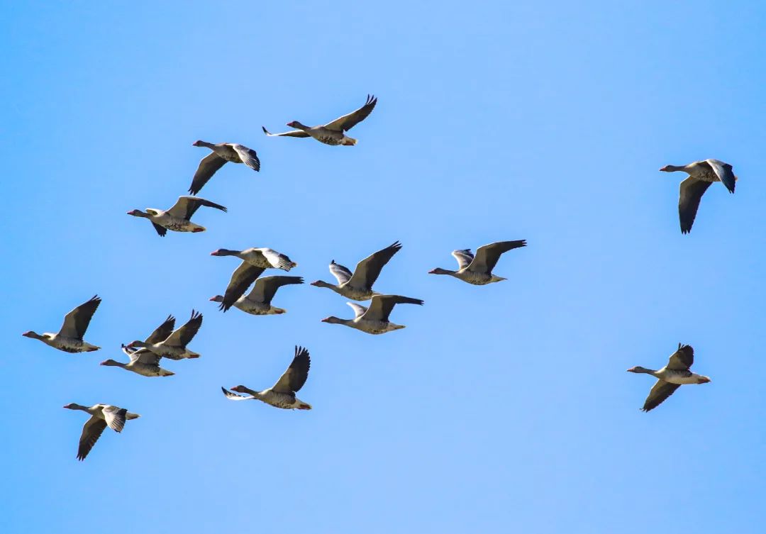 脖子较长,腿位于身体的中心支点,行走自如。有迁徙的习性,迁飞距离较远。喜群居,飞行时成有序的队列,有一字形、人字形等。