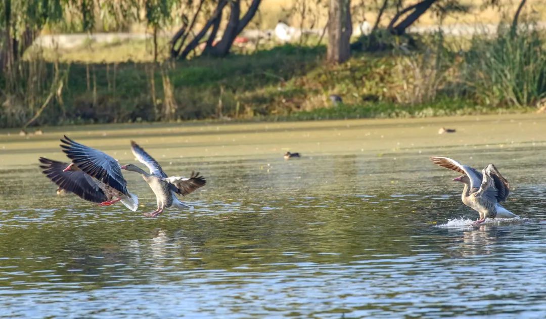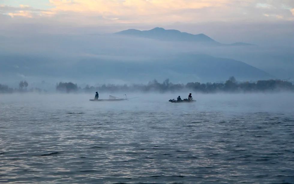 雁鸭齐鸣,鸥鹭共舞,渔船穿梭一派人与自然和谐共生的景象
