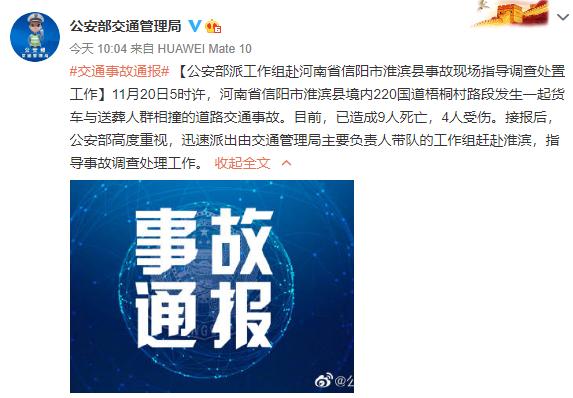 3)20日5时许,信阳市淮滨县境内220国道梧桐村路段发生一起货车与送葬人群相撞的道路交通事故,已造成9人遇难,4人受伤。公安部派工作组赴事故现场指导调查处置工作。