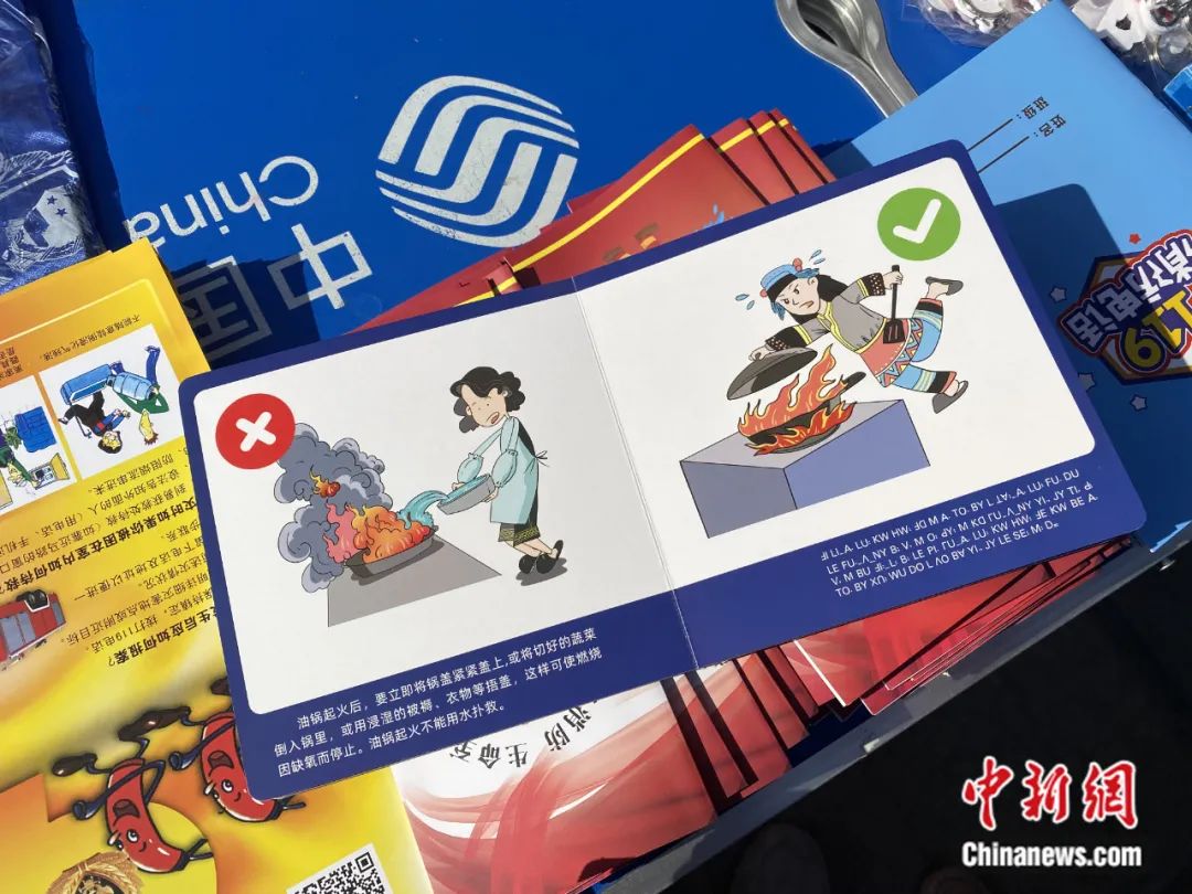 傈僳语消防安全宣传“掌中宝”中的一页:油锅起火不能用水扑救,要立即用锅盖将火苗紧紧盖住。李玉素 摄据了解,这本“掌中宝”需要和服务队队员简单学会的5句傈僳语配合使用。“掌中宝”以图片展示日常行为、用勾叉表明安全与否,队员则用“您好”“我是消防队员”“我是来搞消防安全宣传的”“这是正确的”“这是错误的”5句傈僳语来配合宣教消防安全知识。因为在语言上形成互通,图片展示也清晰明了,这种接地气的消防宣传方式在当地取得了很好的传播效果。