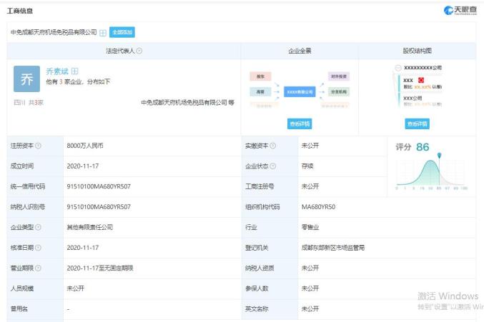 天眼查专业版数据显示,中免成都天府机场免税品有限公司已于11月17日在成都东部新区市场监管局登记注册,注册资本为8000万。