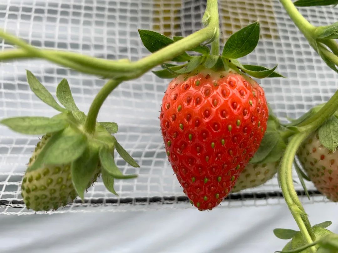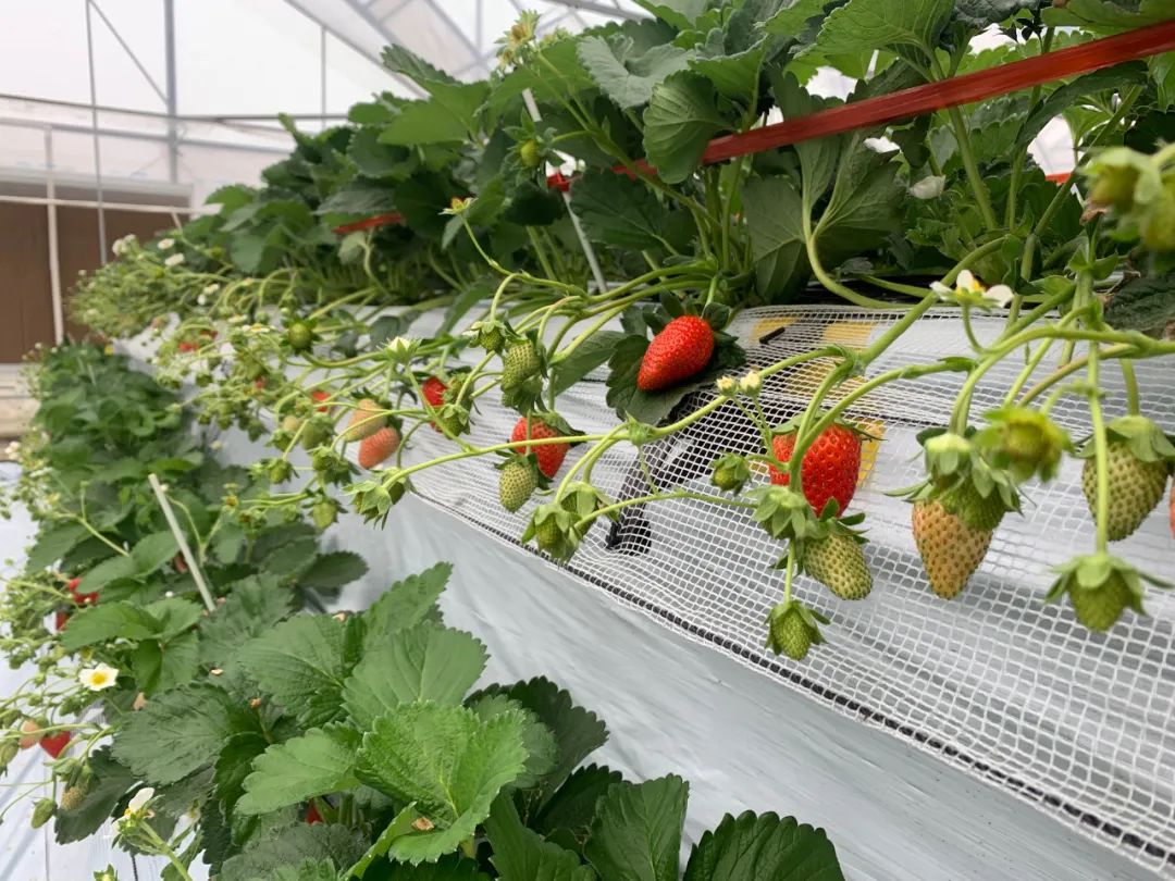 刘博士介绍“通过引进先进的栽培技术,使得草莓苗受光性更好,亩产可达6000-8000斤,是普通种植方式的2倍。草莓完全可以达到零农残标准。”