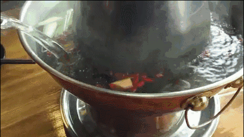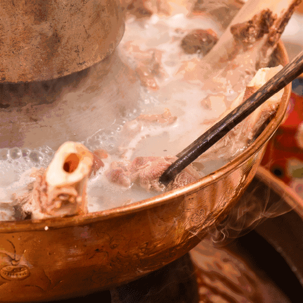 做羊蝎子的汤底,一般含干辣椒、香叶和大料(南方人称八角)等等。红色的汤底带着骨头熬出来腻腻的精华,浓厚醇香。