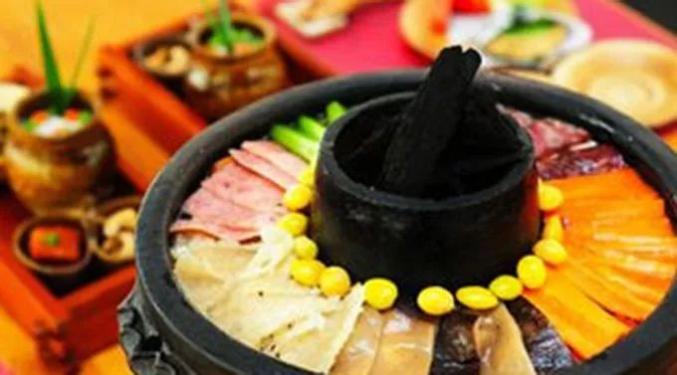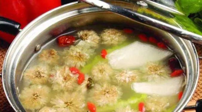 传说菊花火锅是慈禧太后首创的,不但味道鲜美,而且清香爽神,风味独特。其做法是将鲜菊花瓣浸泡洗净后,再放入加有明矾的水中漂洗一遍,捞起沥干备用。在火锅中加入鸡汤或肉汤之类的汤汁,煮沸后先将鸡片、肉片、鱼片等等生料投入,过1分钟左右投入菊花瓣,再煮片刻即可食用。