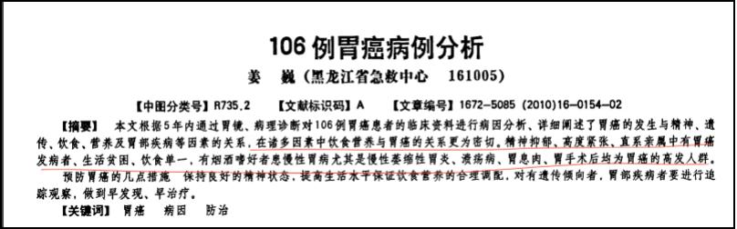 黑龙江省急救中心曾对106例胃癌病例进行分析,发现在诸多因素中,饮食营养与胃癌的关系更为密切。⑧