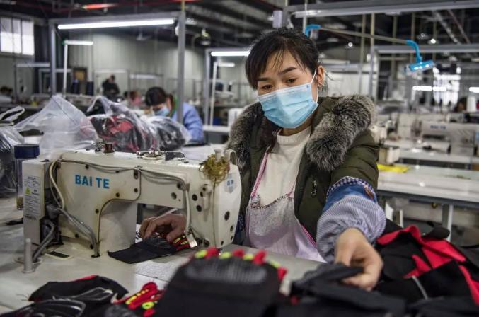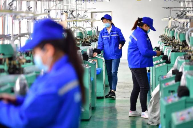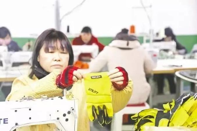 很快,大卡车拉来80台机器,药妇沟社区工厂开张了,脚动机转、手拉布走,一件件半成品手套,在生产线加工而成……