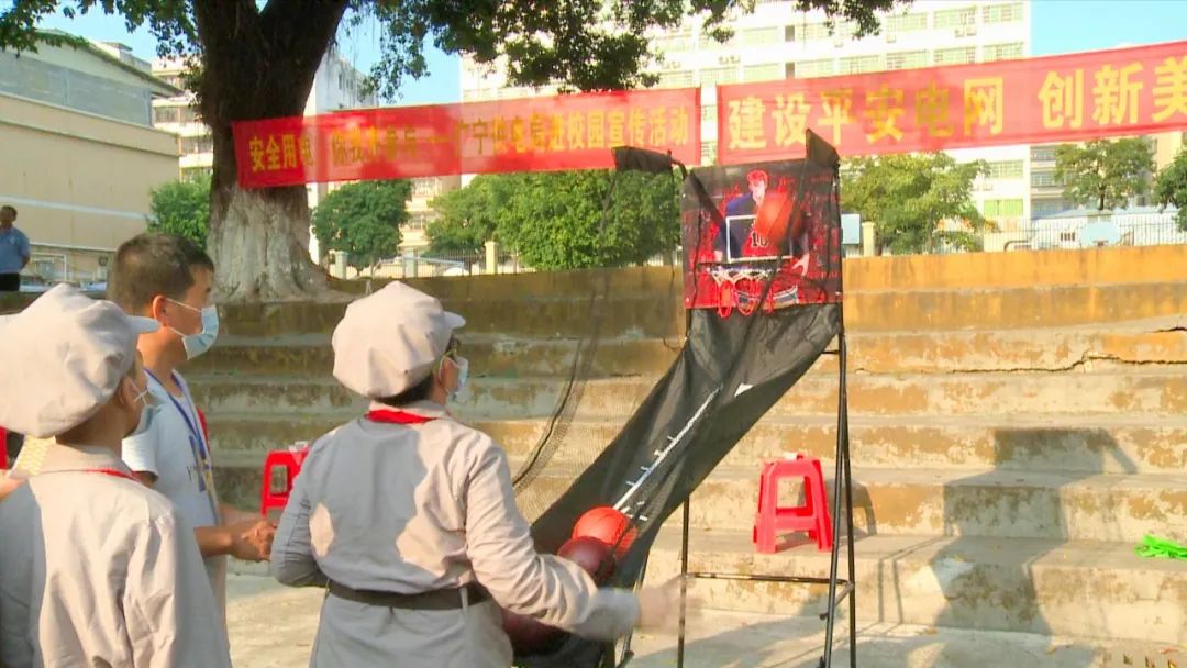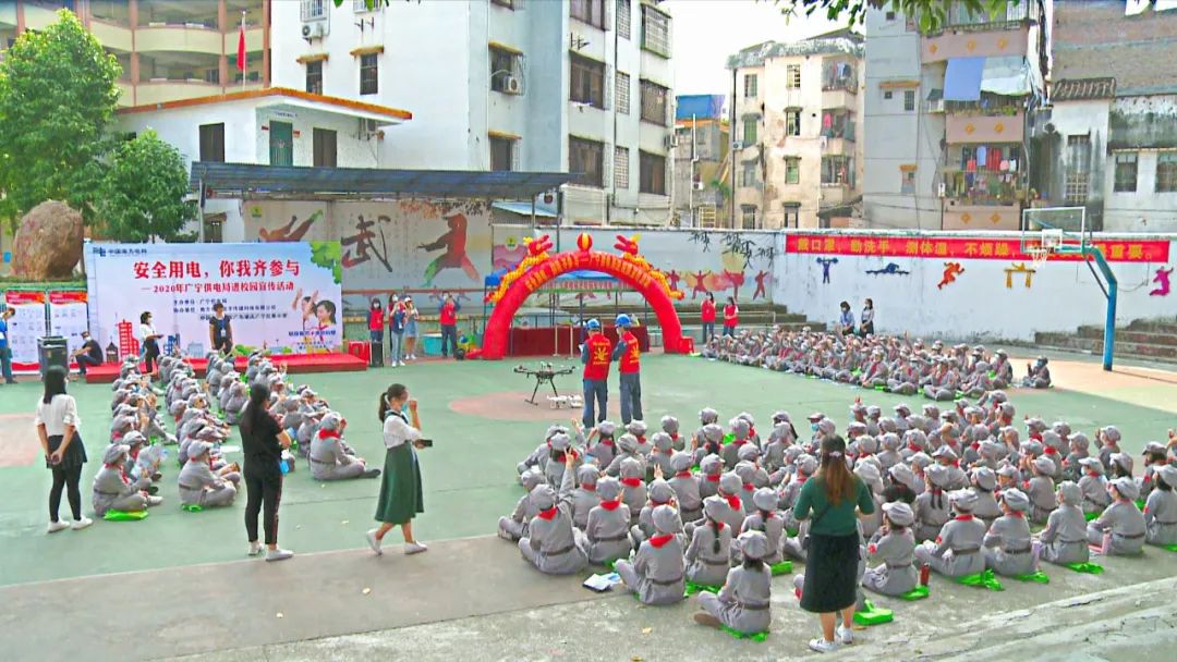 广宁红军小学教师 罗冬青:今天,供电局30多名工作人员来到我们学校与师生代表开展了别开生面的安全用电进校园宣传活动,内容丰富多彩,包括电力设施保护、用电法律法规、电价政策宣传以及无人机飞行表演。