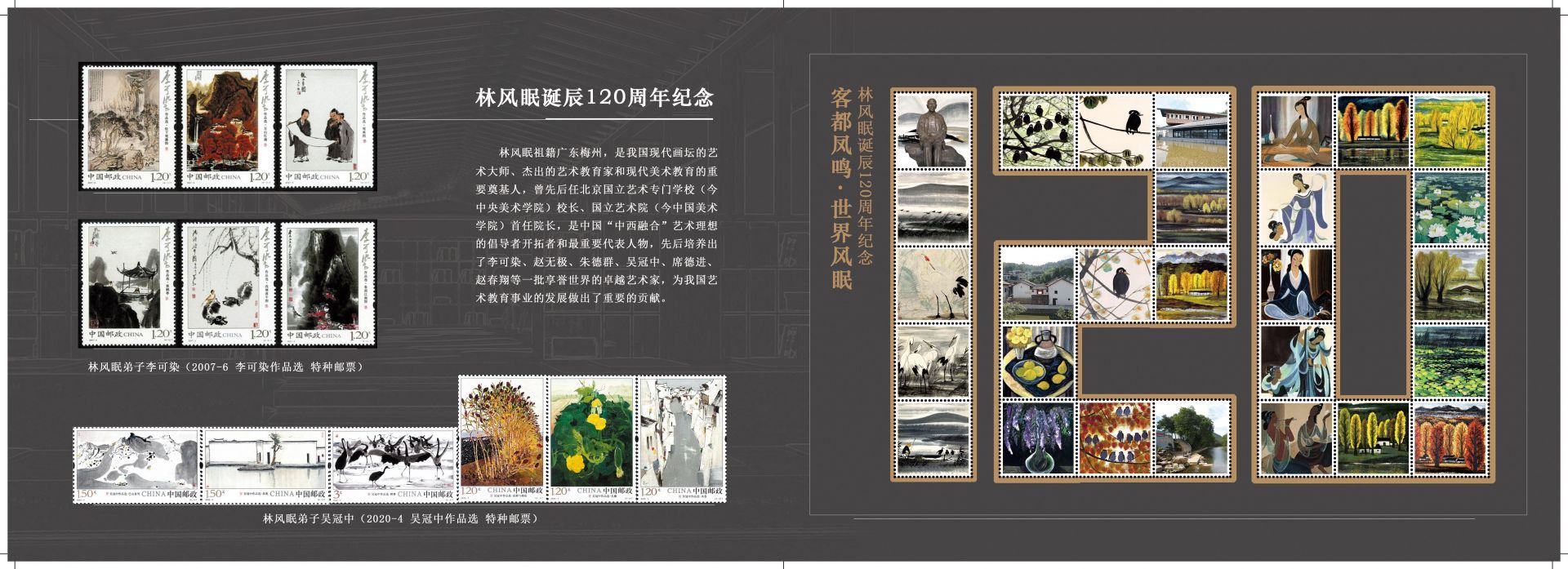 记者看到,《林风眠诞辰120周年》纪念邮折内含有林风眠书画作品纪念张一版、林风眠弟子李可染作品选特种邮票一套6枚、林风眠弟子吴冠中作品选特种邮票一套6枚。在林风眠书画作品纪念张上,林风眠先生的绘画作品呈阿拉伯数字“120”排列,代表林风眠先生诞辰120周年。