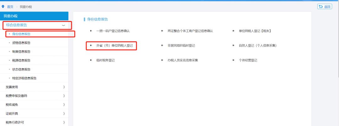 功能节点:电子税务局——我要办税——综合信息报告——身份信息报告——外省(市)单位纳税人登记