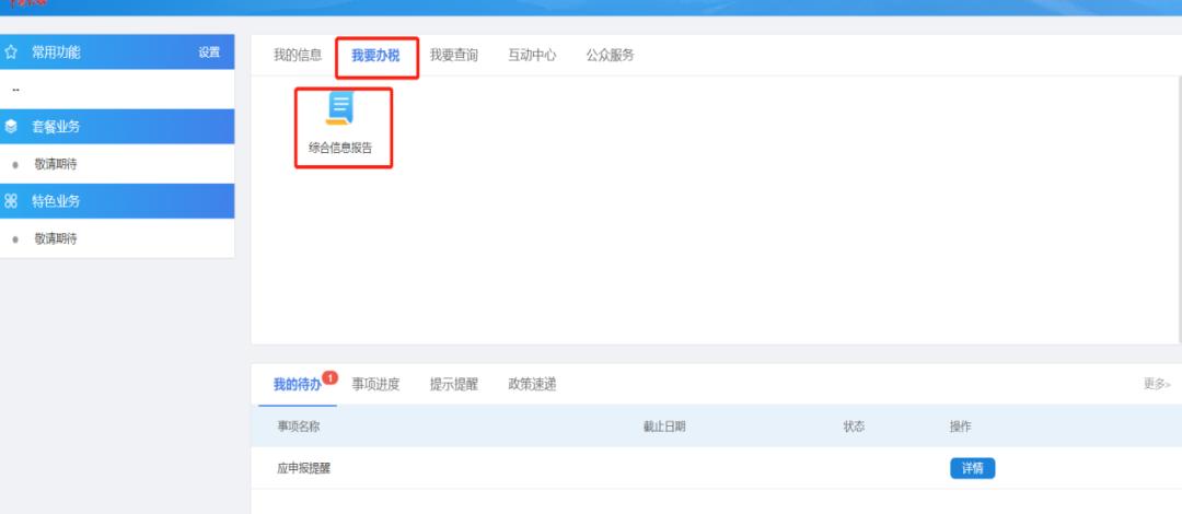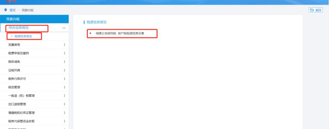 2 成功登录到上海市电子税务局后,点击菜单栏“我要办税”中的“综合信息报告”模块,在左边菜单栏里选择“税源信息报告”,然后在弹出页面右侧选择“综合税源信息报告(城镇土地使用税房产税税源信息采集)”进入到登记页面。