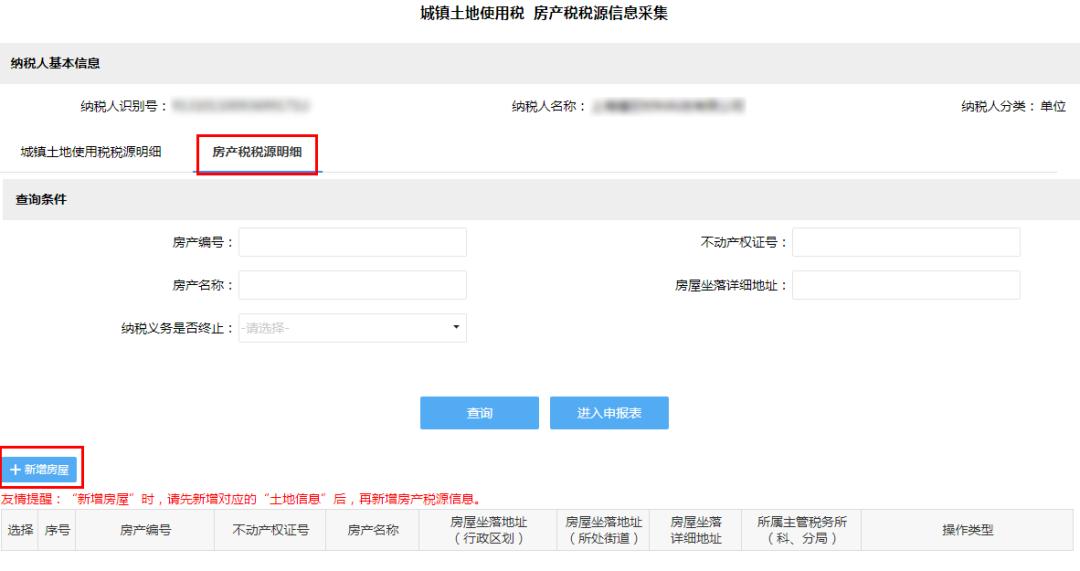 3 进入“城镇土地使用税房产税税源信息采集”页面,进行新增土地或新增房产操作。