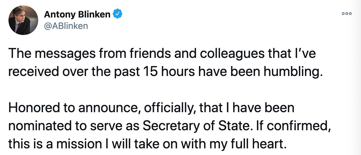 安东尼·布林肯在被拜登正式提名国务卿之后在推特上发文。
